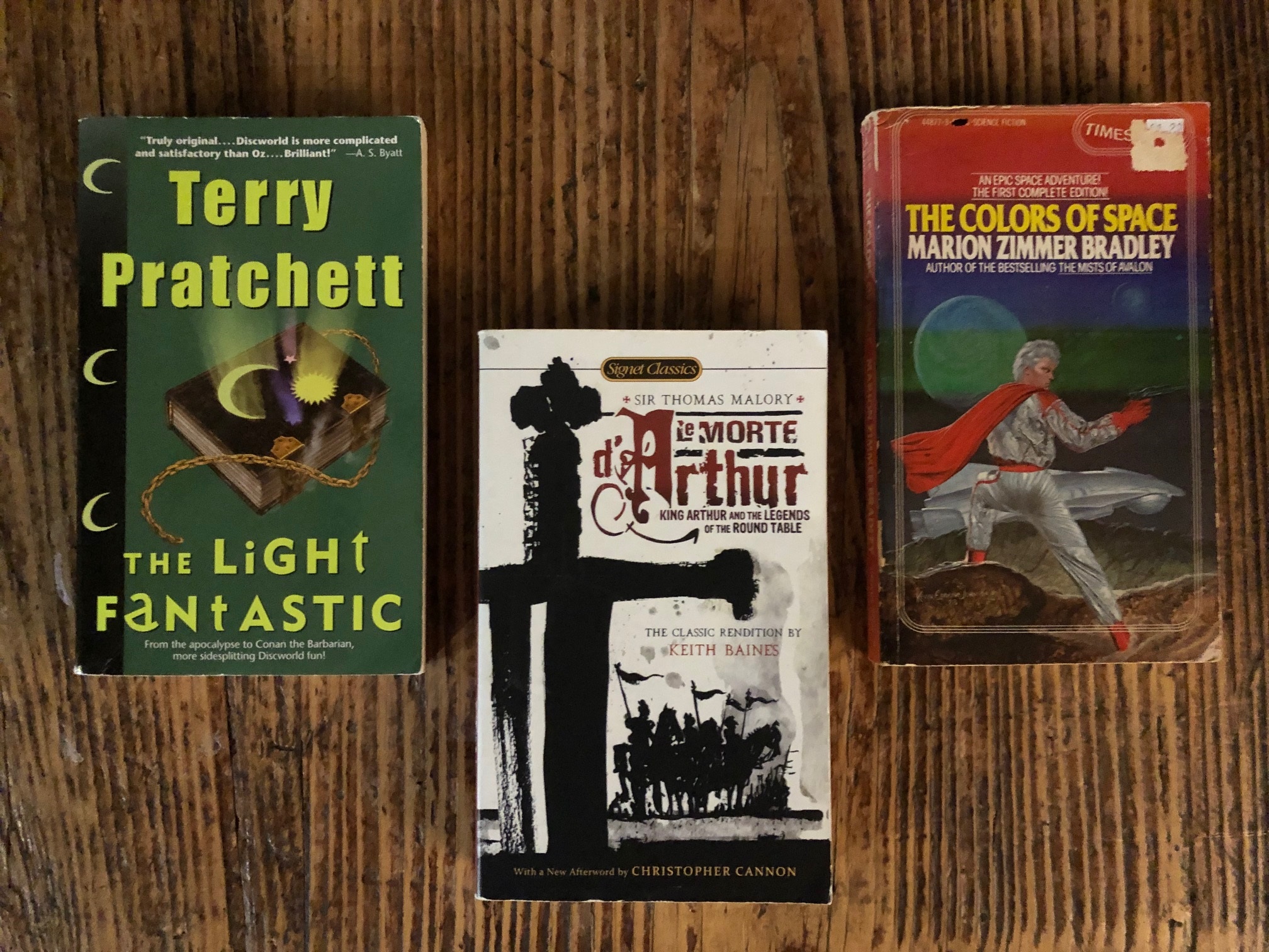 Left to right, we have The Light Fantastic, by Terry Pratchett; Le Morte d’Arthur, by Sir Thomas Mallory, and The Colors of Space, by Marion Zimmer Bradley. I am very pleased with this selection.